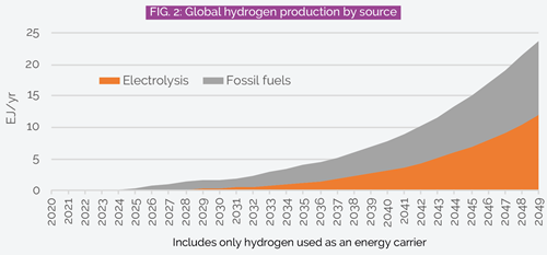 From almost no demand today, we expect demand for hydrogen as an energy carrier to emerge in the late 2020s, to then begin scaling in the mid-2030s due to demand from the transport sector—from shipping (much of it in the form of synthetic fuels produced from hydrogen) and from larger road vehicles (see Fig. 1). Moderate demand from buildings adds to this, and is then buoyed significantly by demand from manufacturing in the 2040s, with transport demand continuing to increase throughout.