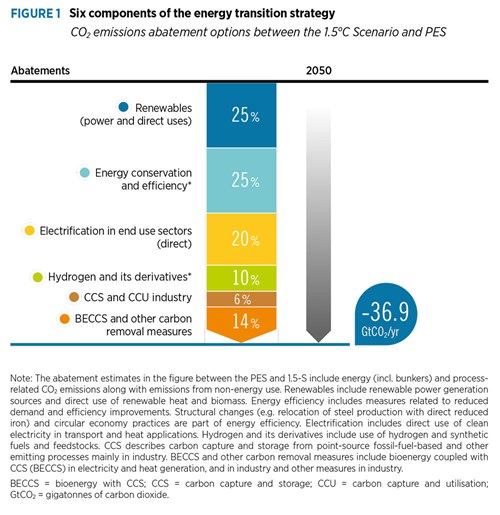 As can be seen in Fig. 1, hydrogen and its derivatives, such as e-ammonia and e-methanol, are a key driver for the abatement of CO2 emissions in 2050, accounting for a tenth of needed reductions in 1.5-S compared with PES. This is significantly less than energy conservation and efficiency improvements, renewables for power and direct uses, and electrification of end-use sectors—but almost twice as much as carbon capture, utilisation and storage.