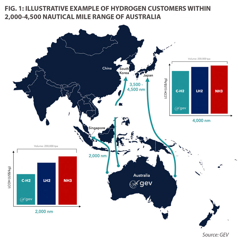 GEV, in collaboration with Vancouver-based Ballard Power Systems, is developing a C-H₂ ship to transport low-carbon hydrogen. GEV’s shipping method has lower projected costs than moving liquefied hydrogen for routes up to 4,500 nautical miles (8,300km), according to Carolan.