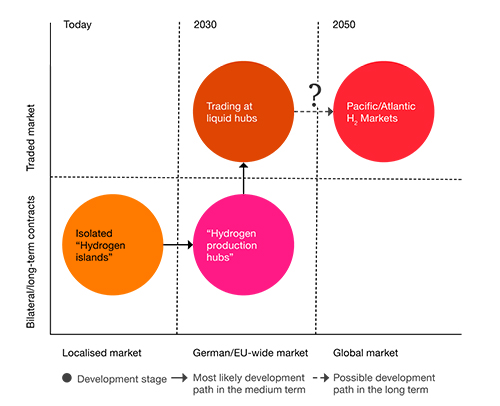 It is expected that hydrogen will initially be supplied within joint ventures and industrial parks, in which players from different sectors combine their hydrogen-related business activities. These isolated ‘hydrogen islands’ would be sufficient to meet German demand if production capacity is built up according to the German National Hydrogen Strategy.