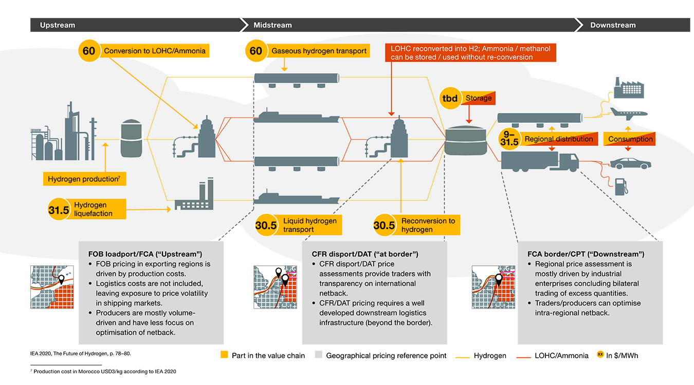 Hydrogen logistics, including patterns of physical gas flows and available storage depots, are complemented by a balancing regime for hydrogen, which allows participants to specify contractual terms that minimise volumetric risks for hydrogen shippers. It is also important for liquid trading to take place at delivery points that exhibit a natural flow of supply and demand and/or are located on the pathway between areas with a structural excess/deficit. The transition to a global hydrogen market is highly dependent on the technological progress regarding hydrogen transportation.