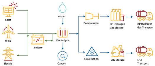 H2 gas produced from the electrolyzer is first compressed to an appropriate pressure, then conditioned to eliminate any impurities, such as water vapor and oxygen (depending on the type of electrolyzer), to meet the required H2 product specification. The H2 gas exiting the dehydration unit will be stored and offloaded either as high-pressure (HP) H2 gas or as cryogenic liquid hydrogen (LH2).