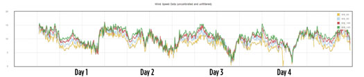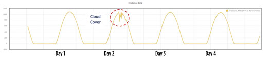 However, both sources of renewable energy are intermittent and fluctuate both on a daily and seasonal basis. Solar PV generates power only during the daytime, depending on the amount of solar irradiance that reaches the panels, which is impacted by cloud cover (FIG. 4). The power generated by wind turbines—provided they are oriented to the correct wind direction—is largely dependent on wind speeds, which vary greatly throughout the day, as shown in FIG. 5.