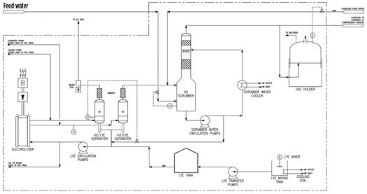 Ultimately, an alkaline electrolyzer was chosen as the preferred technology for the plant. A process flow diagram is presented in FIG. 3. Potassium hydroxide (KOH), or lye, is used as the electrolyte; when a DC voltage is applied to the electrodes, H2 is generated at the negative electrode while oxygen is formed at the positive electrode. The H2 gas is collected in a duct and routed to an H2/lye separator, and then on to a gas scrubber. The gas scrubber acts as a gas cooler, feed water tank and balancing water seal. The scrubber removes residual KOH droplets from the H2 gas and protects the downstream equipment from alkali deposits and corrosion. The scrubbing water is sprayed evenly on the top of the packed bed in the scrubber, collected in the bottom reservoir and pumped back to the top by the scrubber via a heat exchanger that removes heat from the system and cools the gas. Demineralized water is introduced as make-up water to the bottom water basin of the scrubber. It is from the gas scrubber that feed water is mixed with the lye and then routed to the electrolyzer.