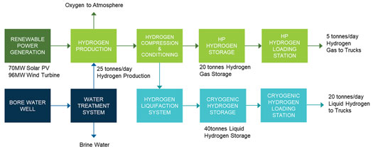 AHP Stage 1 is designed to produce 25 metric tpd of green H2 from bore water using electrolysis and renewable energy sourced from onsite renewable power generation (FIG. 2).