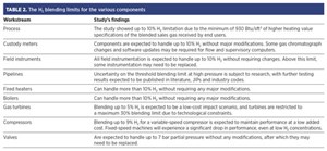 Multiple local network components were assessed to determine the expected limits. The study’s findings indicated there was no common limiting H2 value that is valid for all parts of the natural gas network infrastructure. The blending limits for the various components are shown in FIG. 2 and summarized in TABLE 2.