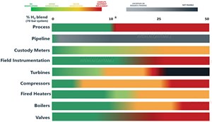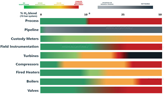 Blending H2 directly into the grid was studied based on various components, which included process, pipelines, custody meters, field instrumentation, gas turbines, compressors, fired heaters, boilers and valves. Seven cases were studied covering a range of injection percentages for H2 to assess the impact on the network.