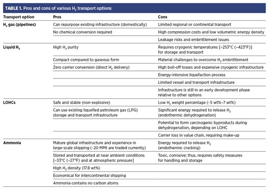 The challenge for H2 is that it is difficult to transport across borders in its elemental form. Whether as a gas or a cryogenic liquid, it presents technical and economic challenges, including low energy density, boil-off losses and costly storage. H2 carriers, such as liquid organic H2 carriers (LOHCs) and ammonia, offer varying trade-offs (TABLE 1).