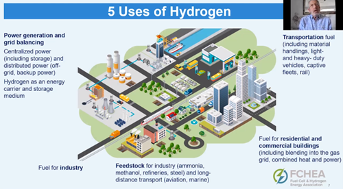 Markowitz also explained the five major uses of hydrogen—power generation and grid balancing, transportation, fuel for industry, feedstock for industry, and heat for buildings. The diversity of the five uses are mirrored in the approach used by the Department of Energy in its H2@Scale project, which in turn mirrors various regional hydrogen development programs in the EU, the UK, Asia and Australia.