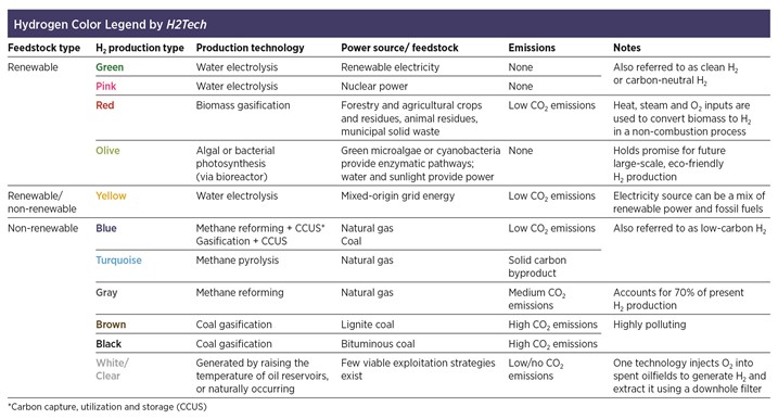 A handy legend for the colors of H2 production also appears below for industry reference. For questions about these classifications, please email Editors@H2-Tech.com.