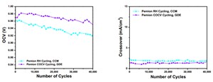 Performance testing on the Pemion membrane and polymer included the DOE, COCV protocol – a combined chemical and mechanical stability accelerated stress test designed for fuel cell membranes – as well as the DOE RH cycling mechanical durability protocol. The tests, which were run for over 40,000 cycles with electrochemical assessments every 24 hours, demonstrated exceptional stability of the membrane in various membrane electrode assembly (MEA) configurations. Critically, MEAs containing Pemion membranes exhibited minimal decreases in open circuit voltage (OCV) throughout the lifetime of the test, alongside exceptionally low and stable gas crossover.