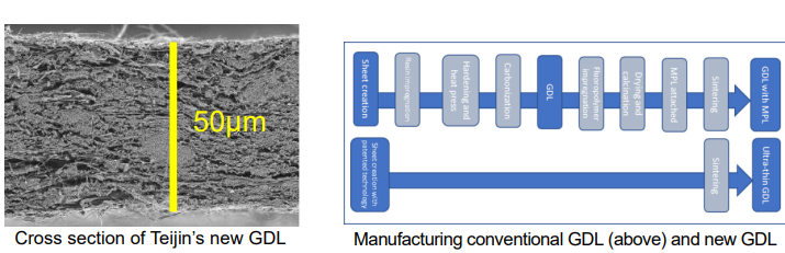 PotenCia enables the new GDL to achieve excellent conductivity without damaging the catalyst layer inside the fuel cell while Twaron contributes to high durability and water repellency. As a result, a conventional microporous layer (MPL) is not required, allowing the new GDL to be slimmed down to 50 micrometers, which is less than half the thickness of a conventional GDL. The new GDL is also expected to reduce production costs by shortening the manufacturing process as well as reducing the number of raw materials required.