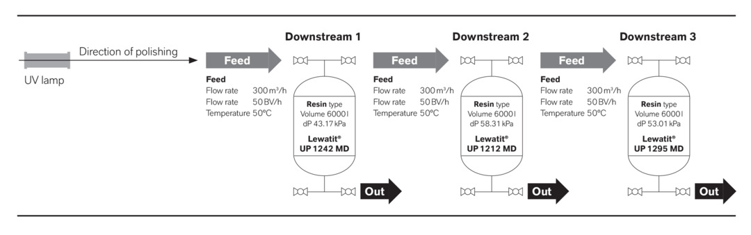 Ion exchangers continuously purify the water circuits. To stabilize the water cycle quality, a partial flow of around three to six percent of the total water volume is continuously purified in a polisher unit. LANXESS recommends an upstream UV lamp to oxidize the organic matter (TOC) followed by a combination of anion and cation exchange resins and a final polisher filter.