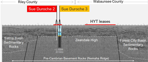 The proposed Sue-Duroche-3 well is located on the Zeandale High, a prominent structural feature on the crestal parts of the Nemaha Ridge. A 2D seismic survey acquired by the Kansas Geological Survey in 1997 provides an image of the geological structure and features of Zeandale High. This seismic survey also geologically links the prospect to the recently acquired leases in Wabaunsee County.
