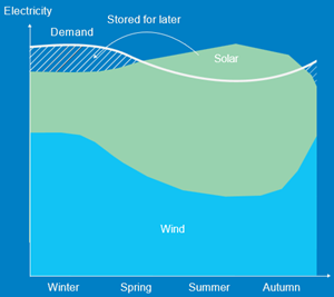 Just as there are daily peaks in electricity production, there are also seasonal variations. At higher latitudes, it is necessary to heat the homes during winter, while mid- to low-latitude countries will have a higher demand for cooling during summer. Similarly, for the higher latitudes, there will be a gap between producing more renewable electricity in the summer while having the greatest need for electricity during the winter.