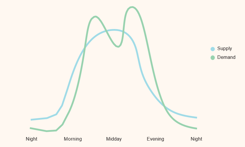 This is an example of how the energy demand cycles over the course of a normal weekday in a relatively developed energy grid. In a future energy system run on renewable energy sources; however, there will be peaks and valleys in the generation of energy as well (FIG. 2). The sharp peak in energy consumption that the grid experiences when people wake up or get home after a long day at work does not always align perfectly with periods of bright sunshine or intense winds.
