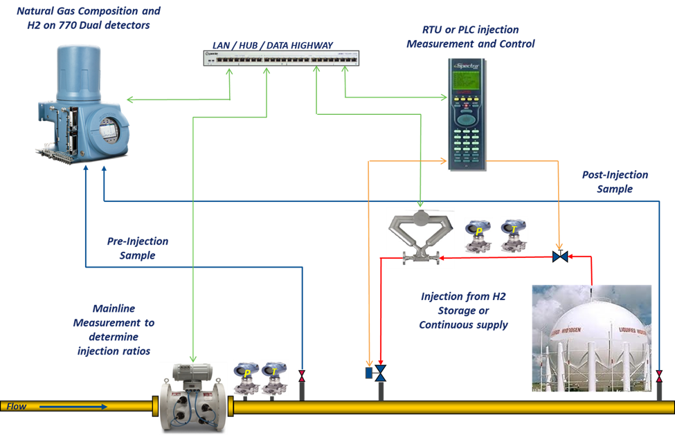 Blended H2 controls. A typical H2 blending station is shown in FIG. 5 and includes a full-bore ultrasonic flowmeter to measure the incoming gas flow, a Coriolis meter and control valve to measure and control the H2 addition, and a downstream gas chromatograph to confirm the resulting blend.
