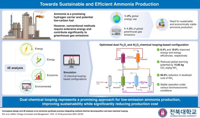 Building on this concept, a research team led by Assistant Professor Sunghyun Cho from the School of Chemical Engineering, School of Semiconductor and Chemical Engineering at Jeonbuk National University in South Korea, has developed a new dual-chemical looping process combining Al2O3 and iron oxide (Fe2O3). "Our approach combines methane thermal decomposition with Al2O3- and Fe2O3-based chemical looping cycles," explains Dr. Cho. "This method enables ammonia synthesis without the energy-intensive steps, significantly improving both sustainability and efficiency." Their study was made available online on October 29, 2025, and published in Volume 348, Part B of Energy Conversion and Management on January 15, 2026.