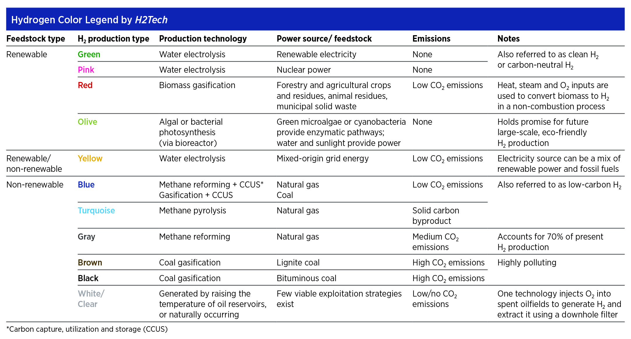 Technical articles are authored by technology experts and officials working in the H2 sector and curated by H2Tech’s award-winning editorial team. Our quarterly editorial coverage includes CO2-neutral green and blue H2, management of high-emissions gray and brown H2, as well as developing methods of H2 production. A legend for the types (or “colors”) of H2 production, as commonly referenced in industry jargon and further defined by the editorial team of H2Tech, appears below for reader reference.