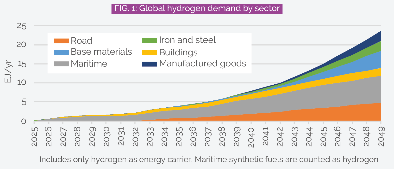 From almost no demand today, we expect demand for hydrogen as an energy carrier to emerge in the late 2020s, to then begin scaling in the mid-2030s due to demand from the transport sector—from shipping (much of it in the form of synthetic fuels produced from hydrogen) and from larger road vehicles (see Fig. 1). Moderate demand from buildings adds to this, and is then buoyed significantly by demand from manufacturing in the 2040s, with transport demand continuing to increase throughout.