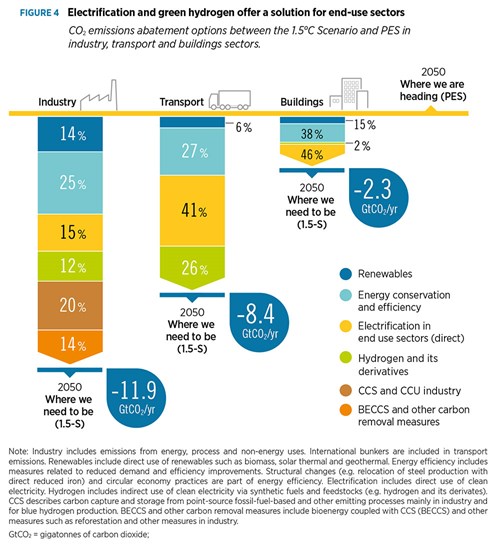As can be seen in Fig. 4, hydrogen and its derivatives will cut CO2 emissions from transportation—especially medium- and heavy-duty trucking, air, marine and rail—by over a quarter in 1.5-S compared to PES by 2050, abate 12pc of emissions from industry—steel-making, and less so cement and mining—but none for buildings.