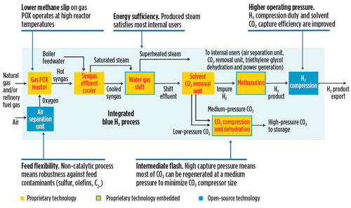 The gas POX–solvent process is the best option for large-scale blue H2 projects. FIG. 6 shows the principle advantages of integrating it with other proprietary and open-source technologies.