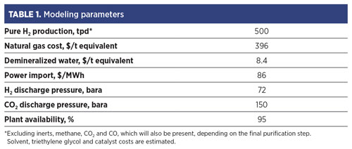 The proprietary blue H2 processa is an end-to-end lineup that maximizes the integration of the gas POX and solvent technologies. Compared with an ATR unit, modeling shows (based on the parameters in TABLE 1) that a lineup producing 500 tpd of pure H2 would have: