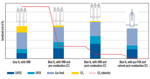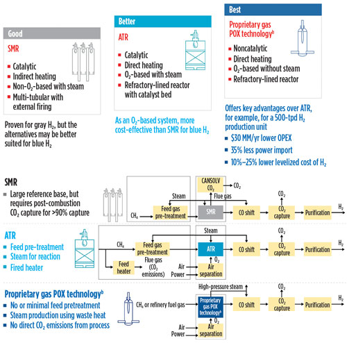 This article considers three technology options for greenfield blue H2 projects: SMR, autothermal reforming (ATR) and a proprietary gas POX technology (FIG. 2).