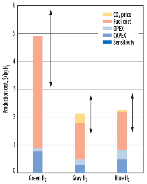 With the cost of CO2 at $25/t–$35/t, blue H2 becomes competitive against gray even with higher capital costs, and green H2 still may be more than double the price of blue H2 by 2030 (FIG. 1).4 Some forecasts indicate that cost parity will occur around 2045.12