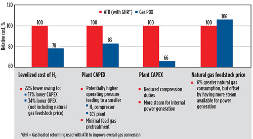 Gas POX technologyb provides substantial savings compared with ATR—a 22% lower levelized cost of H2 (FIG. 5). These savings come from a 17% lower CAPEX owing to the potential for a higher operating pressure leading to a smaller H2 compressor (single-stage compression), CO2 capture and CO2 compressor units, and a 34% lower OPEX (excluding the natural gas feedstock price) from reduced compression duties and more steam generation for internal power. Gas POX technology consumes 6% more natural gas, but this is offset by power generation from the excess steam.