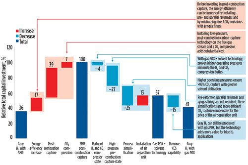 Gas POX technology. Gas POX technology is also an O2-based system with direct firing in a refractory-lined reactor, but it is a noncatalytic process that does not consume steam and has no direct CO2 emissions. It, too, can be combined with pre-combustion carbon-capture technology for blue H2 production. Compared with SMR, gas POX technology saves money by maximizing the carbon-capture efficiency and simplifying the process lineup, both of which offset the cost of O2 production (FIG. 4).