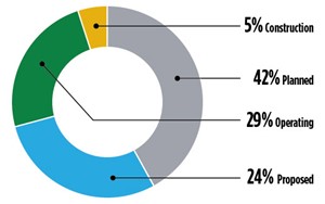 According to the GEI Database, 85 projects are in the construction stage—projects that have received all necessary approvals and have started construction. The NEOM (Helios Green Fuels) project is in this stage and will produce green H2 and ammonia in Saudi Arabia. The development will connect 4 GW of wind, solar and storage with electrolysis to produce 650 tpd of H2. The H2 will produce 1.2 MMt of green ammonia, which will be transported worldwide, where the H2 will be re-extracted.