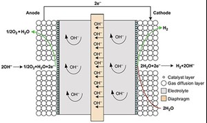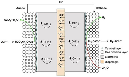 Alkaline electrolyzer. Alkaline electrolyzers (FIG. 2) contain a caustic water solution that includes a 25 vol%–30 vol% of potassium hydroxide, sodium hydroxide and sodium chloride.2 The liquid electrolyte allows ions to be transported between electrodes and is not consumed during the chemical reaction. However, it must be replenished periodically due to alkaline electrolyzer losses over time. The advantages and disadvantages of alkaline electrolyzers include: