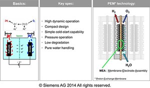 PEM electrolyzer. The core of a PEM electrolyzer is the proton-conducting polymer membrane from which the name is derived.1 This membrane separates the reaction compartments for H2 and oxygen, providing ionic contact between the electrodes, which is essential to the electrochemical process. The gas production occurs on the surface of the respective precious metal electrode, as shown in (FIG. 1). The advantages and disadvantages of PEMs include: