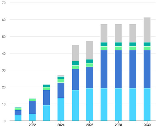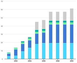Regardless, a massive amount of electrolyzers must be manufactured. Topsoe is constructing an industrial-scale SOEC manufacturing facility with an initial 500-megawatts (MW) production capacity. Nel plans to build an automated gigawatt (GW)-electrolyzer manufacturing facility in Michigan, U.S. The facility aims to have a production capacity of up to 4 GW of alkaline and PEM electrolyzers. The company is also planning to build a new fully automated production line at its facility in Norway. Larsen & Toubro plans to set up a GW-scale manufacturing facility for electrolyzers based on McPhy’s alkaline electrolyzer in India.