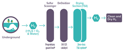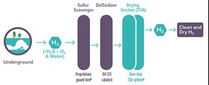 The operating conditions are well suited for sulfur scavengers that operate best in water-saturated conditions. If needed, a deoxo system can help to remove any O2 before entering the dehydration section.a H2 is classically dried with alumina or molecular sieves, but a TEG can advantageously be used if the water specification is not too tight (above 30 ppm mol).