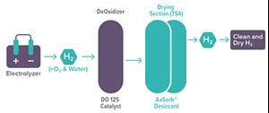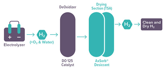 A purification and drying unit (PDU) is located directly downstream of an electrolyzer. This purification package includes a deoxo catalyst and molecular sieve driers in a zero-loss TSA system. Depending on the electrolysis technology (AEL/PEM), H2 comes out with different O2 levels but is always water saturated. O2 is easily reacted with H2; subsequently, the gas is cooled, and water is knocked out before entering the dehydration section (FIG. 8). H2 from the PDU is ultra-pure and can be certified with a maximum of 1-ppm vol O2 and 0.1-ppm vol water.