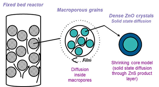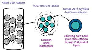 FIG. 4 illustrates how zinc oxide (ZnO) guard bed materials work for hydrogen sulfide (H2S) removal. H2S first diffuses from the bulk to the grains and inside the macropores. Then, H2S reacts with ZnO to form zinc sulfide (ZnS) and water. A shrinking core model accurately represents the kinetics of this gas-solid reaction. This considers that as the adsorbent is consumed, H2S must diffuse through ZnS to react with fresh ZnO.