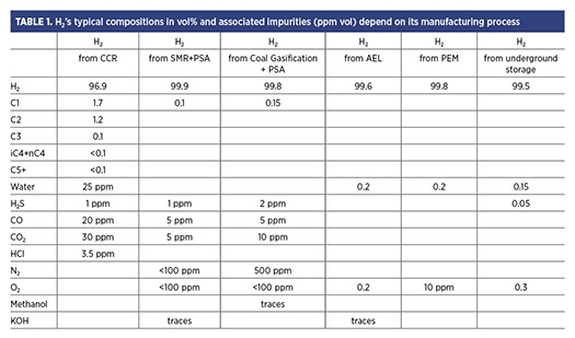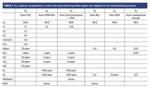 When H2 is used in a more sensitive application, such as catalytic hydrogenation of chemicals or direct use in a fuel cell, trace impurities must be carefully examined and addressed so downstream operations can run efficiently. TABLE 1 summarizes H2 purity from different manufacturing processes, focusing on trace impurities. Another concern regarding H2 impurities is storage; only underground storage can answer the need for massive storage. However, one issue with underground storage is that even if ultra-pure H2 is injected, impurities coming from the storage will be found in H2 at the time of withdrawal. TABLE 1 also presents the impurities found in H2 geologically stored in a salt cavern.