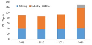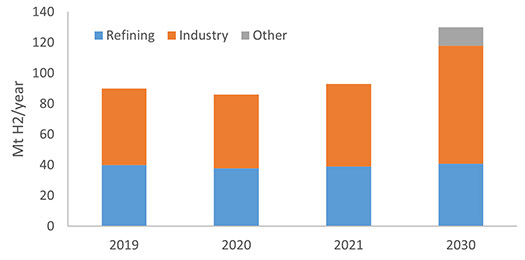 Refineries use about 40 MMtpy of H2 that is mainly produced by naphtha crackers, steam methane reformers (SMRs) and catalytic naphtha reformers [continuous catalytic reforming (CCR) or semi-reg]. H2 is used mainly for hydrodesulfurization and hydrocracking reactions. The general manufacturing industry is the other big H2 consumer, especially in producing ammonia (fertilizers), methanol (to produce other chemicals) and the direct reduction of ore within steel mills. Industrial consumption of H2, excluding refineries, is about 50 MMtpy and is forecast to reach more than 75 MMtpy in 2030, as depicted in FIG. 1. New applications, such as H2 for transportation, are also forecast to become significant from 2030 and beyond.