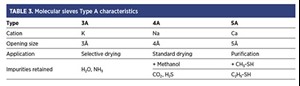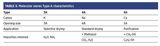 TABLE 3 shows that type A molecular sieves (3A/4A/5A) are crystalline metal alumino-silicates. They consist of a 3D zeolite structure made of silica and alumina that carries a net negative charge balanced by a cation, such as Na+. Within the zeolite structure, the cations are located over the pore opening, thus partially blocking the entrance to the zeolitic cage. Therefore, the cations determine the pore opening size, only allowing small enough molecules to enter the structure to be retained by the negative charge. This is why they are often referred to as molecular sieves.
