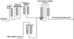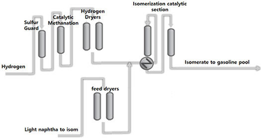 Protecting the isomerization catalyst by using a combination of adsorbents and catalyst. The isomerization process (used to increase the octane number of a fuel by converting normal paraffins to iso-paraffins) is a perfect example of how a combination of adsorbents and catalysts have been employed to purify H2. In this process, H2 is fed with naphtha over a Pt-based catalyst. This catalyst is sensitive to CO/CO2 and moisture. The H2 required comes from an adjacent CCR or a local SMR, each with their own impurities (chloride, sulfur, CO, CO2 and/or water). The following H2 purification scheme is recommended so the isomerization catalyst can reach a much higher lifetime than when H2 is fed directly to the system. FIG. 7 illustrates the H2 purification steps, comprising a ZnO guard that removes H2S and potentially traces of hydrochloric acid—a catalytic methanator that converts traces of CO/CO2 into CH4, and a set of driers loaded with 5A molecular sieves that dry and can also act as a last barrier against carbon oxides.