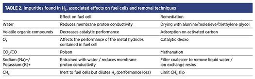 The ISO-14687-2019 norm dictates tight specifications on H2 quality so that it can be used in fuel cells to create electricity. Several technologies exist, such as molten carbonate, alkaline, solid oxide or proton exchange membrane fuel cells (PEMFCs). Fuel cells are essentially reverse electrolyzers where H2 and O2 react to form water and electricity. Therefore, materials used in fuel cells are the same as in electrolyzers, which makes them sensitive to contaminants. In the field of fuel cells, PEMFCs are dominant, and TABLE 2 lists the effects of contaminants.