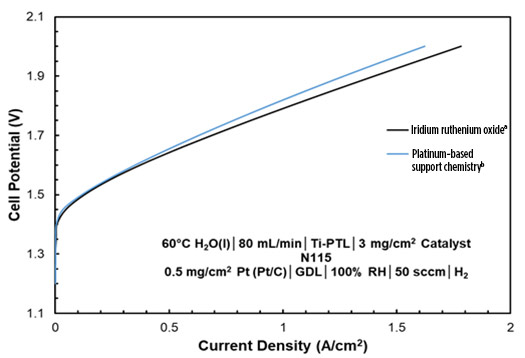 The author’s company has developed a novel platinum-based support system and iridium deposited on the system can be reduced to less than 15% iridium.a,b This new grade has been shown to be fully stable in anode conditions. Accelerated stress tests have shown equivalent performance to competitor iridium oxide grades. The accelerated stress tests were designed to simulate up to 100,000 hr of use.