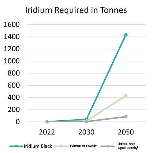 Typically, only 0.3 g/kW of iridium is required when using an iridium ruthenium oxide; therefore, only 12 Tt of iridium would be required by 2030 for 40 GW of PEM electrolysis, and only 430 Tt of iridium would be required by 2050 for 1,430 GW of PEM electrolysis (FIG. 2).