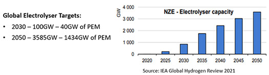 These policies indicate ambitious targets globally for electrolyzer production—an estimated 100 gigawatts (GW) must be installed by 2030, increasing to an estimated 3,585 GW of electrolysis by 2050 (FIG. 1). Of this production, it is expected that 40% will use proton exchange membrane (PEM) technology. With the recent introduction of the Inflation Reduction Act (IRA) in the U.S., and the REPowerEU H2 roadmap in the European Union (EU) coupled with the new EU Green Deal Industrial Plan, these volumes look to become a reality.