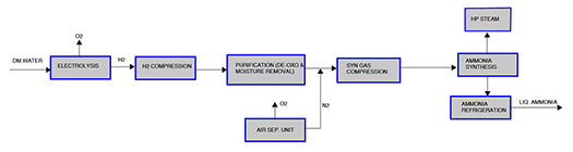Nitrogen purging equipment and piping requirements will be supplied from the ASU. The ASU’s air compressor will also meet plant air and instrument air requirements. These requirements should be considered in the air compressor capacity determination. Cooling water will be required to produce H2 (and oxygen, if required) in electrolysis, compression, NH3 synthesis loop and NH3 refrigeration.