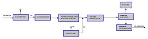 Electrolyzers. H2 is produced in electrolyzers operating at atmospheric pressure or under pressure with the help of demineralized water. The produced oxygen can be compressed, transported via pipeline, liquified and transported by tankers, or vented to the atmosphere.