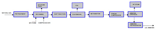 ASU. The high-purity nitrogen required for NH3 synthesis is produced from a cryogenic ASU, and its nitrogen production capacity will depend on the NH3 plant’s production rate. The ASU will produce gaseous and liquid oxygen, and its offtake to nearby industries should be explored.
