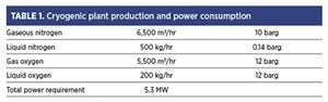 Care should be taken while defining the contaminants in the atmospheric air near the project site. This is due to various incidents that have occurred inside the cryogenic cold box due to insufficient contaminant definitions in the air. One example was a forest fire polluting the atmospheric air and the design did not consider such contaminants. Typical cryogenic plant production and power consumption are given in TABLE 1 for 10 parts per million (ppm) of oxygen in nitrogen product purity level.